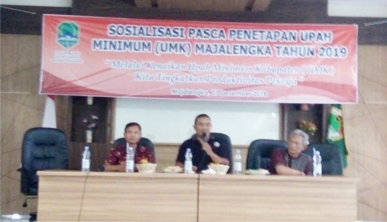 Hal ini terungkap saat sosialisasi pasca penetapan UMK 2019 yang diselenggarakan olehDinas Tenaga Kerja dan Perindustrian (Disnakerin)  Kabupaten Majalengka, Jumat, (7/12/2018). Nampak hadir Kepala Dinas Tenaga Kerja dan Perindustrian Kabupaten Majalengka H. Ahmad Suswanto,  S.Pd. M.Pd.  perwakilan perusahaan perusahaan yang ada di Kabupaten Majalengka, perwakilan serikat pekerja Kabupaten Majalengka dan pemateri kegiatan selain dari Disnakerin Kabupaten Majalengka nampak hadir H. Dadang Sudiono  M.Si.  dari Dosen Universitas Majalengka dengan tema kegiatan melalui kenaikan UMK  kita tingkatkan produktivitas pekerja.