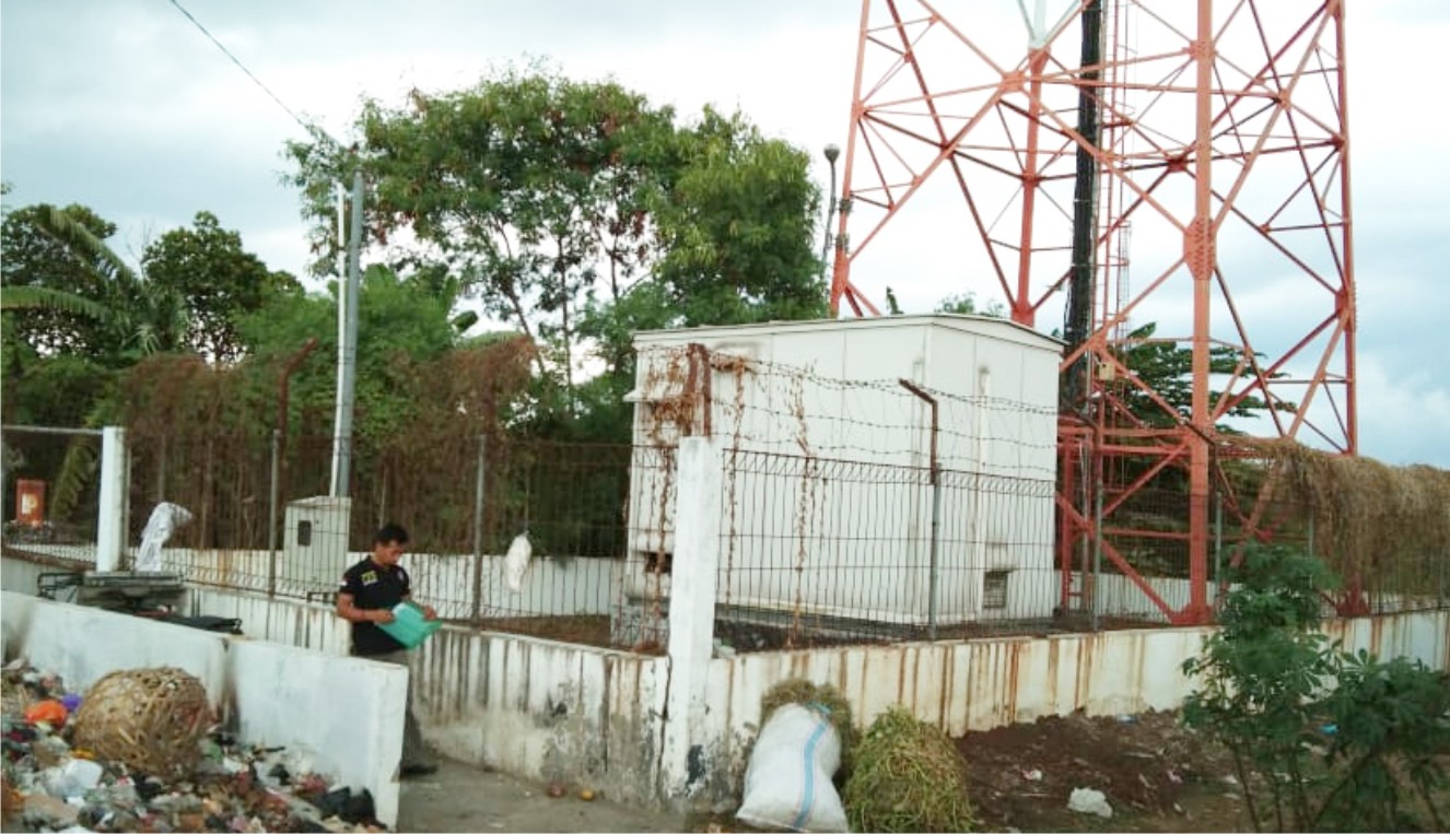 Pantauaan Suara Cirebon, salah satu provider yang berada di area ruko Lemahabang, yang lokasinya berdekatan dengan tempat pembuangan sampah (TPS) kondisi towernya sangat membahayakan. Selain dipenuhi rerumputan, juga besi towernya sudah banyak karat. (Agus)