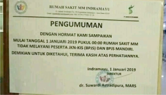INDRAMAYU, SC- Rumah Sakit (RS) MM Indramayu per tanggal 1 Januari 2019 tak lagi menerima pasien pemegang kartu Badan Penyelenggara Jaminan Sosial (BPJS) Kesehatan. Alasannya, kontrak antara BPJS dengan RS MM habis dan tidak diperbaharui.