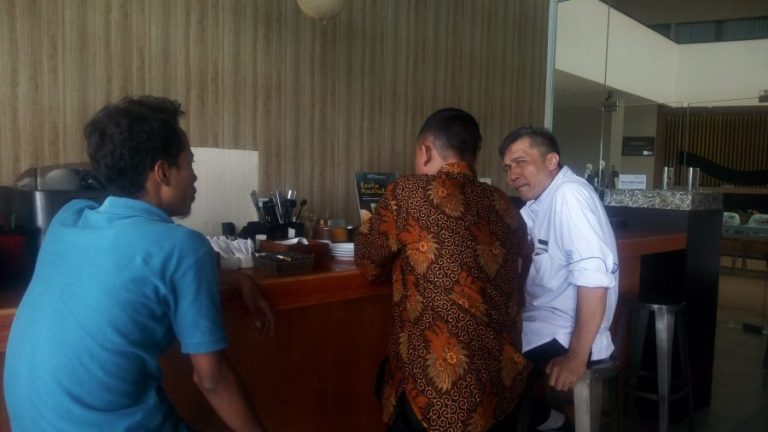 ARIF (baju biru) bersama salahsatu peserta rakerpim perguruan tinggi menegur pihak hotel atas ditemukannya kecoa di salahsatu makanan yang dihidangkan.