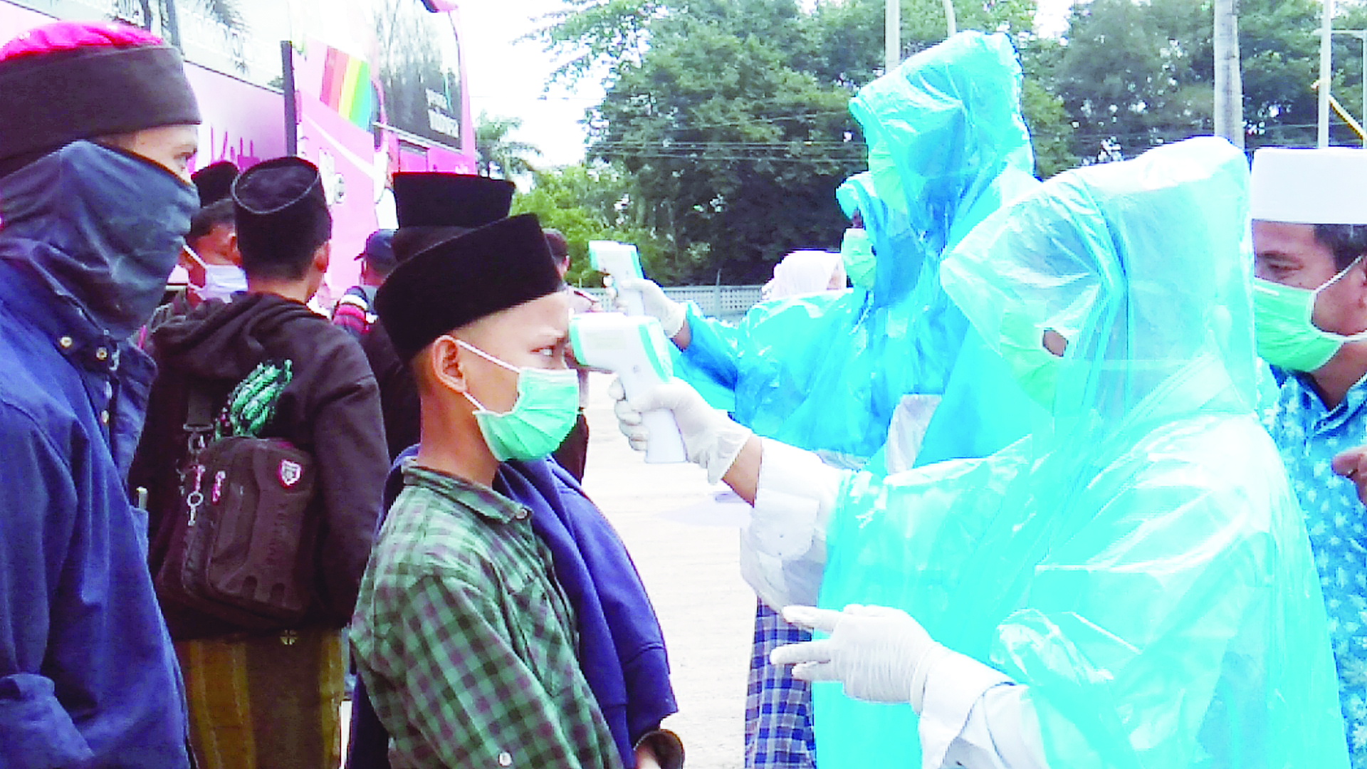 PLUMBON, SC- Ratusan santri yang dipulangkan dari Pesantren Lirboyo Kediri, Jawa Timur tidak langsung pulang ke rumah. Mereka harus menjalani pemeriksaan kesehatan lebih dulu oleh petugas kesehatan yang sudah stand by dengan alat screening dan alat penyemprot disinfektan untuk barang bawaan para santri.