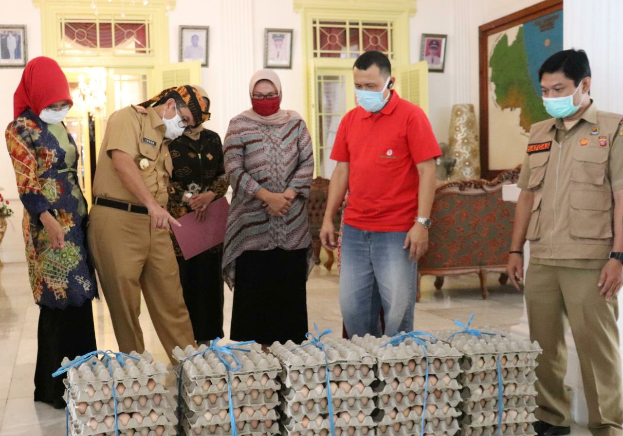 CIREBON, SC- Bupati Cirebon, Drs. H. Imron, M.Ag. menerima bantuan 20 ribu butir telur dari PT Sido Agung Agro Prima. Penyerahan bantuan tersebut dilakukan di Pendopo rumah dinas Bupati Cirebon, Selasa (28/4/2020). Bupati menuturkan, bantuan 20ribu butir telur tersebut akan langsung didistribusikan kepada masyarakat Kabupaten Cirebon yang terdampak virus Covid-19.