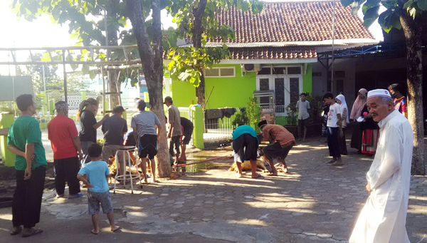 KABUPATEN CIREBON, SC- Puluhan jamaah Masjid Jami Al mujahidin, Komplek Perumahan Sindanglaut Indah, Desa Cipeujeuhwetan, Kecamatan Lemahabang, Kabupaten Cirebon, usai melaksanakan ibadah Salat Iduladha diteruskan dengan kegiatan penyembelihan hewan kurban yang dilaksanakan di halaman masjid setempat.
