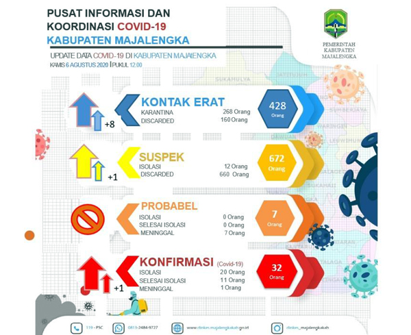 MAJALENGKA, SC- Penambahan kasus terkonfirmasi positif Covid-19 di Kabupaten Majalengka masih belum berhenti. Jumlah kasus positif Covid -19 hingga Rabu (5/8/2020) naik menjadi 31 orang, setelah 3 orang warga kembali dinyatakan terpapar Corona. Ketiga  pasien baru Covid-19 masing-masing berasal dari Desa Bantarwaru, Kecamatan Ligung 2 orang, dan 1 orang dari Desa Leuwikujang, Kecamatan Leuwimunding.