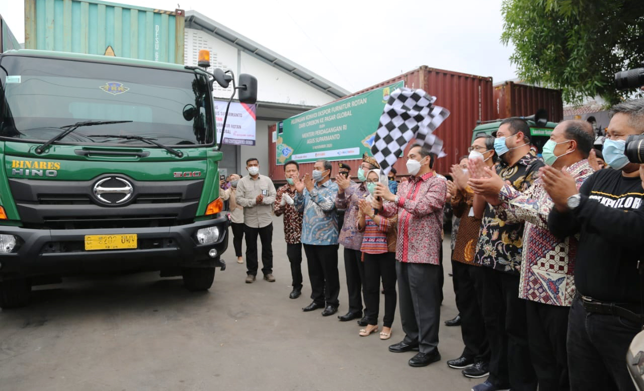 KABUPATEN CIREBON, SC- Menteri Perdagangan, Agus Suparmanto melepas 5 kontainer furnitur rotan hasil produksi tiga pelaku usaha kecil dan menengah (UKM) asal Kabupaten Cirebon binaan Kementerian Perdagangan, yang akan diekspor ke negara tujuan, Kamis (5/11/2020).
