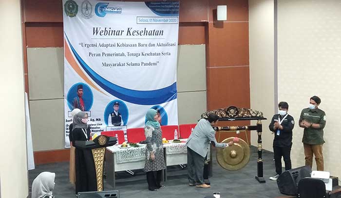 KEPALA JURUSAN KPI, H Moh Aan Burhanudin memukul gong saat membuka acara Comic 2.0 2020, Selasa (17/11/2020). (Foto: Yusuf/SC)