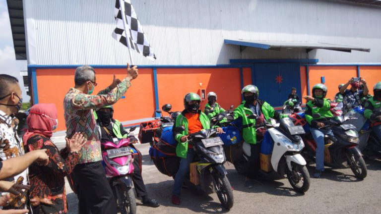 SEKDA KOTA Cirebon Agus Mulyadi melepas armada Ojol yang mengantarkan paket Bansos.* Foto: M Surya/Suara Cirebon