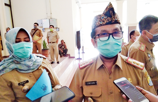 BUPATI Cirebon, Drs H Imron MAg memberikan keterangan kepada sejumlah media usai rapat dengan forkopimda dan dinas terkait, Senin (27/4/2020).* Foto: Islah/Suara Cirebon