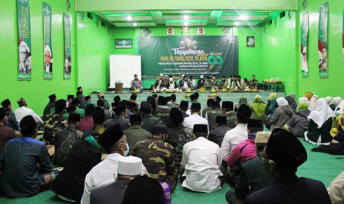 Kegiatan yang dipusatkan di kantor PCNU setempat itu dimeriahkan dengan penampilan marawis, pemotongan belasan tumpeng, istigotsah qubra dan tausyiah dari tokoh kharismatik NU Majalengka, KH Ahmad Sarkoci Subkhi (Abah Oci), Minggu (31/2021).