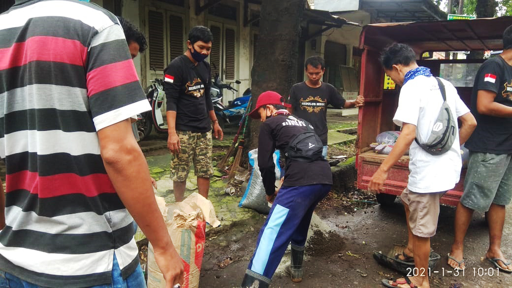 KABUPATEN CIREBON, SC- Sejumlah warga yang tergabung dalam Paguyuban Sedulur Megu (PSM) bergotong royong menambal jalan berlubang di sepanjang Jalan Fatahilah Desa Megu Gede dan Jalan Ki Sabalanang Desa Megu Cilik, Kecamatan Weru, Kabupaten Cirebon.
