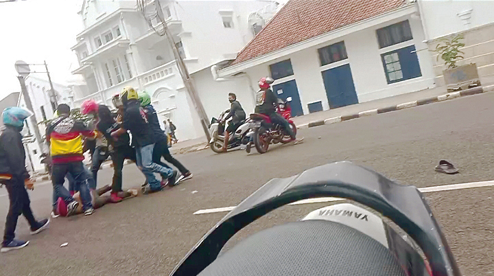 Belum diketahui pengguna jalan roda dua terjatuh disebabkan dipukul atau ditendang oleh sekelompok brandalan motor tersebut. (Surya)