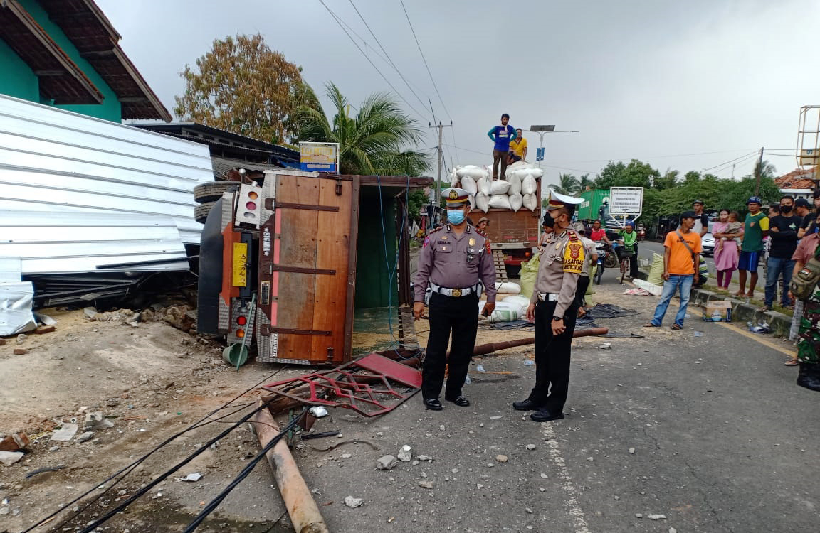 KABUPATEN CIREBON, SC- Sebuah kendaraan truk colt diesel bermuatan penuh, dengan nomer polisi E 9476 PC terguling di pinggir jalan, usai menabrak tiga warung, satu unit rumah warga dan tiang listrik, di Jalan Raya Cirebon-Indramayu masuk Desa Grogol, Kecamatan Kapetakan, Kabuparen Cirebon, Rabu (3/3/2021) pagi.