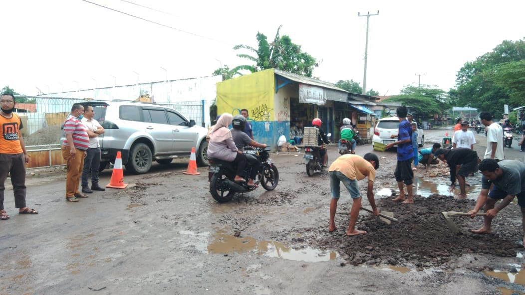 Melihat kondisi jalan yang tidak kunjung diperbaiki dan dibiarkan rusak, masyarakat sekitar mengambil inisiatif melakukan pengurukan mengunakan campuran tanah, pasir dan split agar lubang tidak semakin lebar dan dalam.