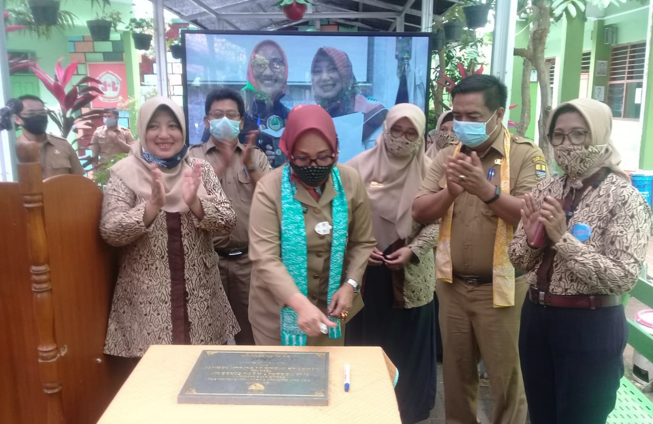 Wakil Wali Kota Cirebon Eti Herawati (tengah) menandatangani prasasti Sekolah Indah di Taman Sehati di SMPN 7 Kota Cirebon, Selasa (9/3/2021).* Foto: Surya/Suara Cirebon