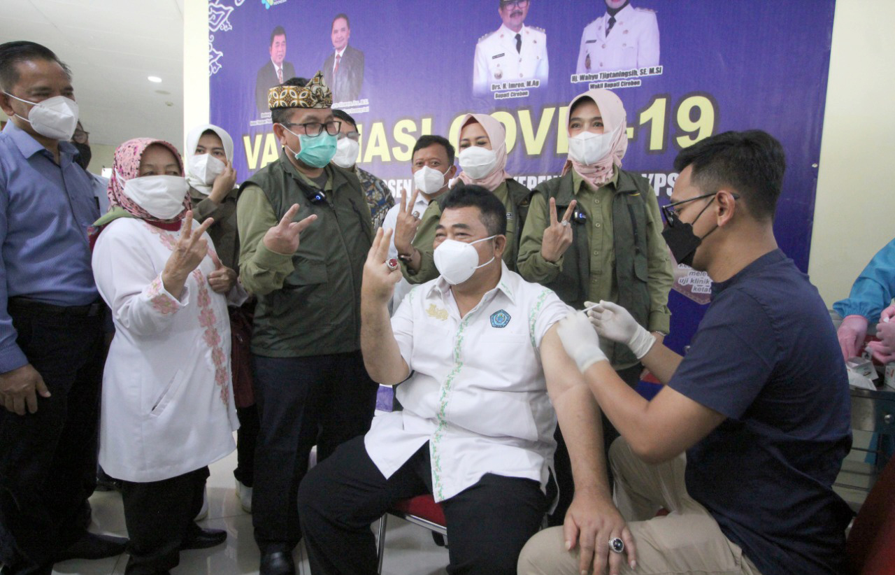 Bupati Cirebon, H Imron didampingi Wabup dan Kadinkes menyaksikan Ketua Yayasan UGJ divaksin (baju putih), Senin (15/3/2021).* Foto: Islah/Suara Cirebon