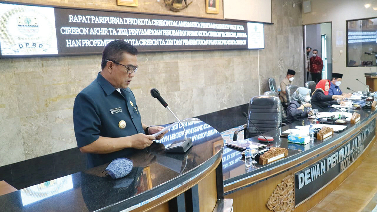 KOTA CIREBON, SC – Wali Kota Cirebon, Drs H Nashrudin Azis SH, menyampaikan Laporan Keterangan Pertanggungjawaban (LKPJ) Akhir Tahun Anggaran 2020 ke DPRD Kota Cirebon dalam rapat paripurna yang digelar di Ruang Griya Sawala DPRD Kota Cirebon, Kamis (25/3/2021). Dalam kesempatan tersebut, Azis menyampaikan langsung nota pengantar LKPJ.