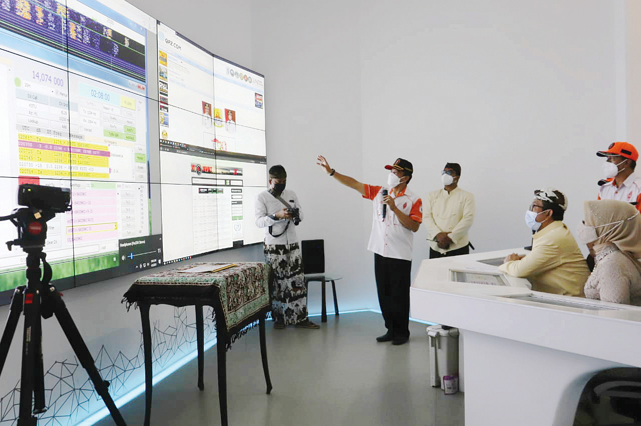 Bupati Cirebon, H Imron saat mengikuti kegiatan Spesial Call bersama Orari yang melibatkan pegiat radio amatir dari 100 negara di Command Center Setda, Jumat (2/4/2021).* Foto: Islah/Suara Cirebon