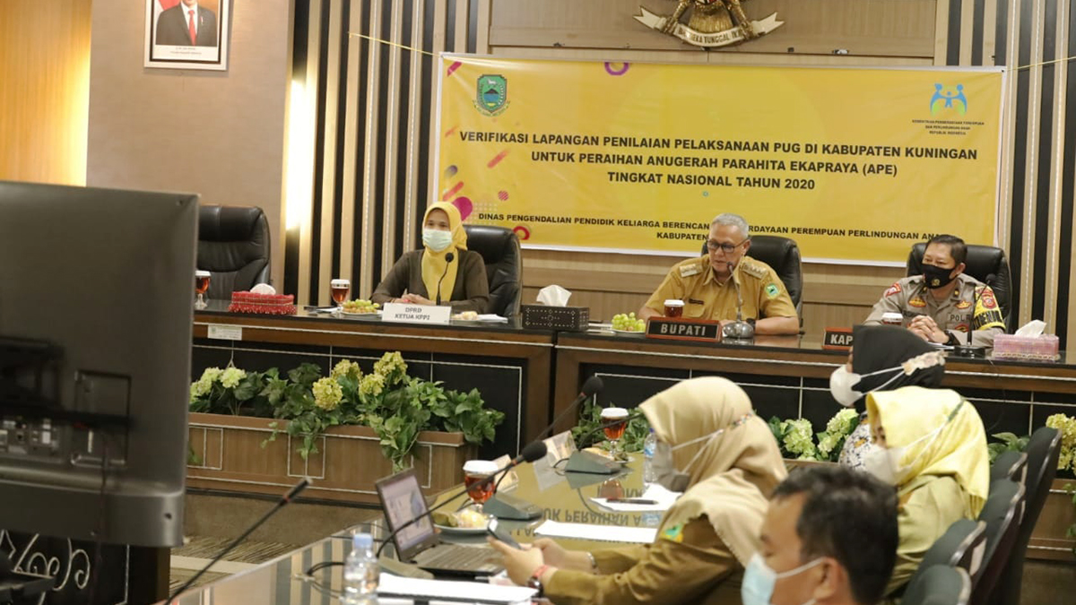 KUNINGAN, SC- Kabupaten Kuningan nampaknya kembali dilirik untuk dinobatkan sebagai peraih Anugerah Parahita Ekapraya (APE), dan telah diverifikasi kriteria-kriteria penilaiannya. Verifikasi penilaian Pengarusutamaan Gender (PUG) Anugerah APE, berlangsung pada Senin (5/3/2021), di Ruang Rapat Linggajati Setda Kuningan.