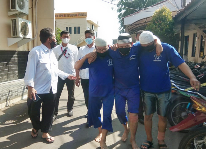SEORANG pelaku tindak pidana terpaksa dibantu rekannya setelah dilumpuhkan petugas karena melawan. Mereka ditunjukkan ke publik saat konferensi pers, Senin (12/4/2021). (Foto: Kirno/Suara Cirebon)