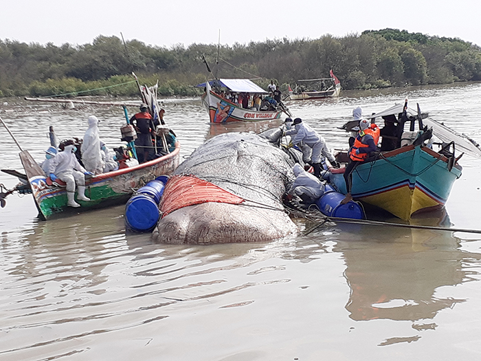 “Makanya kemarin, saya sama tim mengumpulkan alat-alat agar paus itu bisa mengapung dulu. Makanya kita antisipasi, kita akalin pakai terpal dari desa, pakai jaring bekas, kita pakai pelampung. Tadi kita mengikat dulu, setelah mengapung kita tarik. Pelampungnya kita pakai drum, kita isi angin pakai kompresor,” kata Anhar.