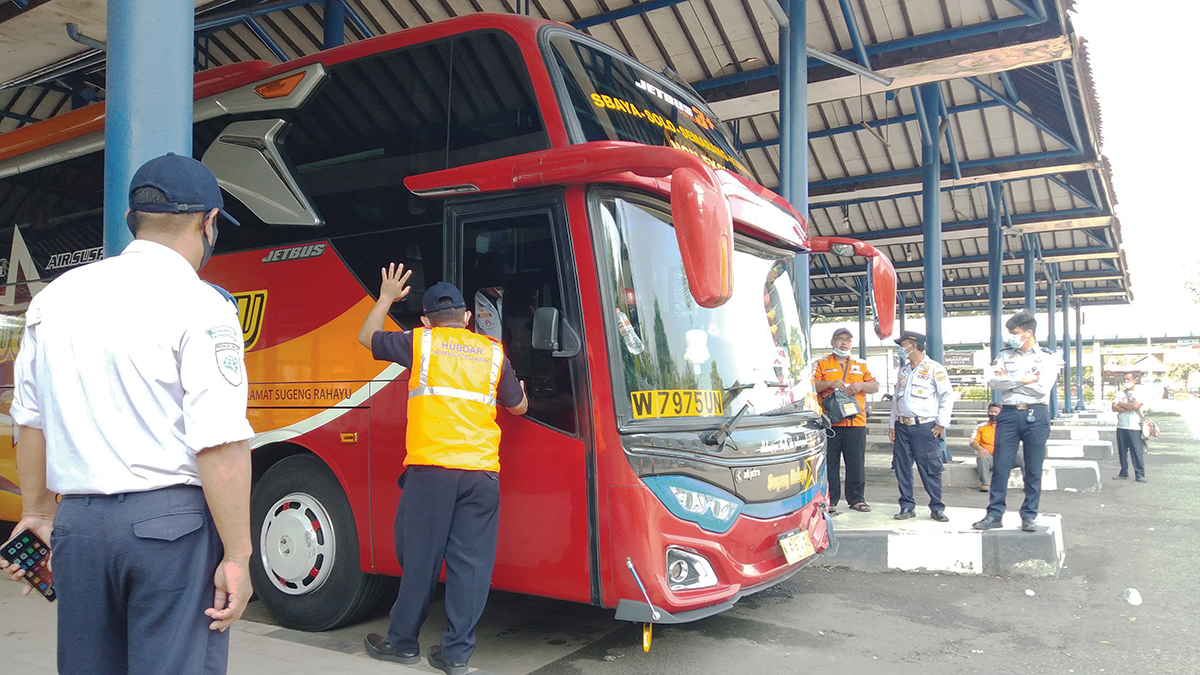 KOTA CIREBON, SC- Kementerian Perhubungan (Kemenhub) Republik Indonesia melakukan ramp check (pemeriksaan fisik dan kelengkapan surat) puluhan mobil bus yang ada di Terminal Harjamukti, Kota Cirebon, Selasa (27/4/2021).