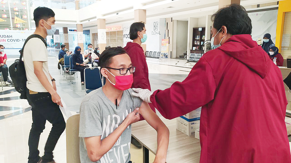 Sejumlah pekerja di Grace City Mall mendapat suntikan vaksin Covid-19 dalam upaya memutus penyebaran wabah, Kamis (17/6/2021).* Foto: Yusuf/Suara Cirebon