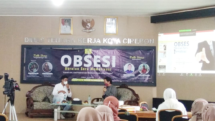 SAAT pemateri sedang melakukan sesi tanya jawab seputar pengembangan diri pada kegiatan Obrolan Seru Motivasi (Obsesi) yang bertemakan “Kenali Diri, Gali Potensi, dan Berkontribusi untuk Negeri,” di aula Disnaker Kota Cirebon, Jalan Ciptomangunkusumo, Kecamatan Kesambi, Kota Cirebon, Sabtu (19/6/2021). Foto: Istimewa