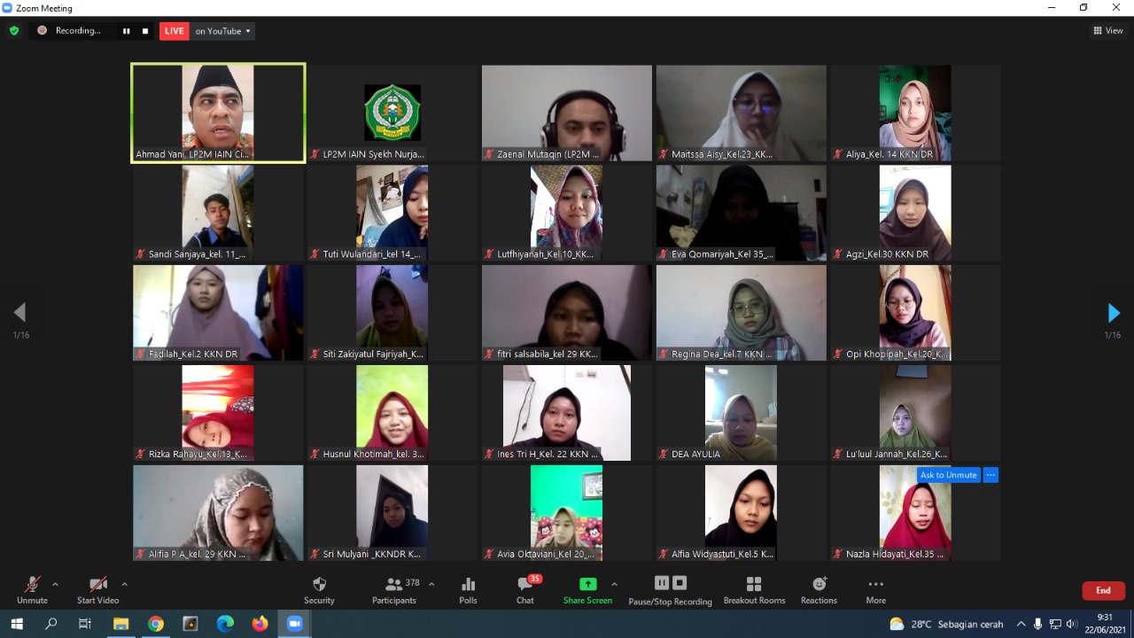 TANGKAPAN layar workshop pembekalan kepada calon peserta Kuliah Kerja Nyata Dari Rumah (KKN-DR) Tahun 2021 LP2M IAIN Syekh Nurjati Cirebon.