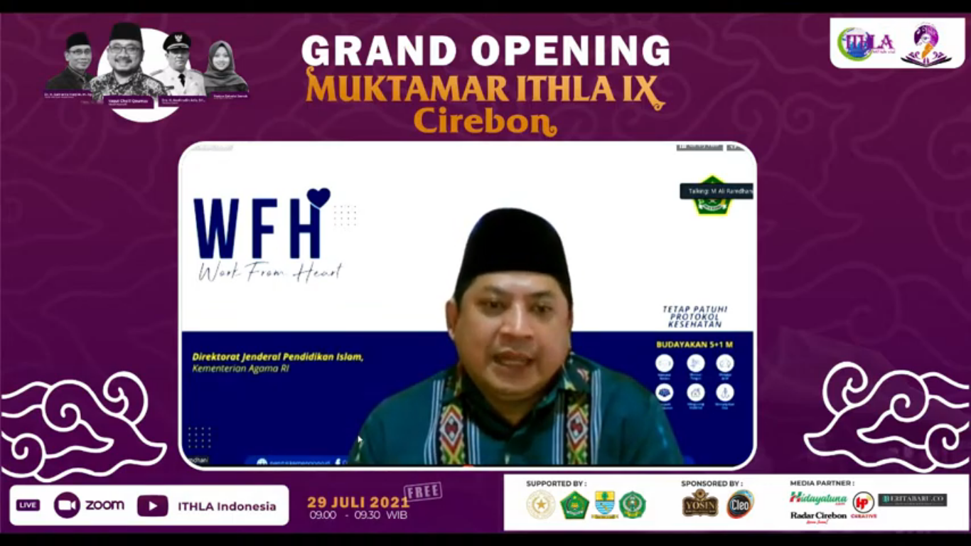 CIREBON, SC- Saat memberikan sambutan sekaligus membuka Muktamar Persatuan Mahasiswa Bahasa Arab Indonesia atau yang dikenal dengan ITHLA secara virtual, Kamis (29/7/2021), Dirjen Pendidikan Islam (Pendis) Kementrian Agama RI, M. Ali Ramdhani juga memberikan pesan-pesannya.