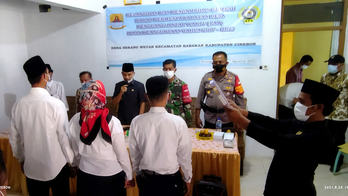 KABUPATEN CIREBON, SC– Camat Babakan, Kabupaten Cirebon, Asep Nurdin melantik dan mengambil sumpah tiga anggota Badan Permusyawaratan Desa (BPD) Pergantian Antar Waktu (PAW), Desa Serang Wetan, Kecamatan Babakan, Kamis (26/8/2021). Turut hadir dalam kegiatan yang berlangsung di aula Desa Serang Wetan tersebut, unsur Muspika Kecamatan Babakan dan tokoh masyarakat setempat.