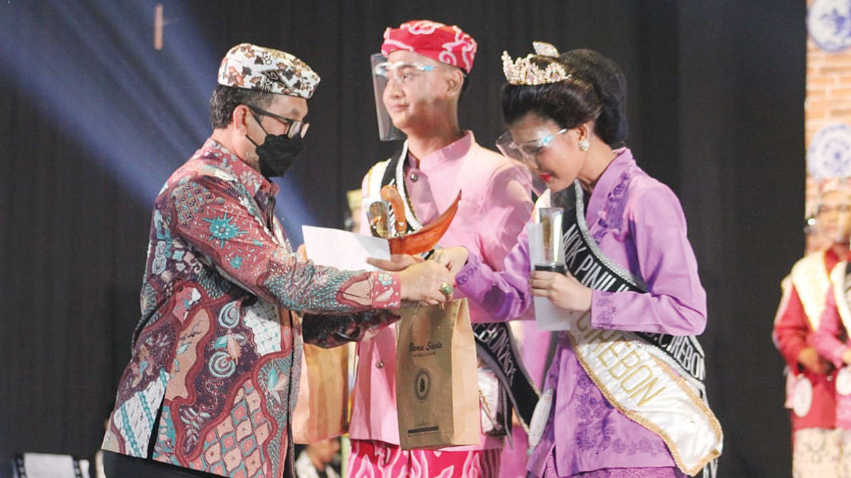 Bupati Cirebon, Imron memberikan hadiah kepada Kacung dan Nok Pinilih saat grand final pemilihan duta pariwisata Nok dan Kacung Kabupaten Cirebon, Jumat (10/9/2021) malam.* Foto: Istimewa