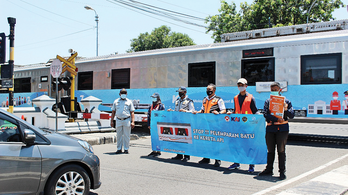 KOTA CIREBON, SC- PT KAI Daop 3 Cirebon bersama Polres Cirebon Kota, Dinas Perhubungan, Jasa Raharja dan Komunitas Edan Sepur melakukan aksi sosialisasi keselamatan di perlintasan KA Jalan Kartini Kota Cirebon, Selasa (12/10/2021).