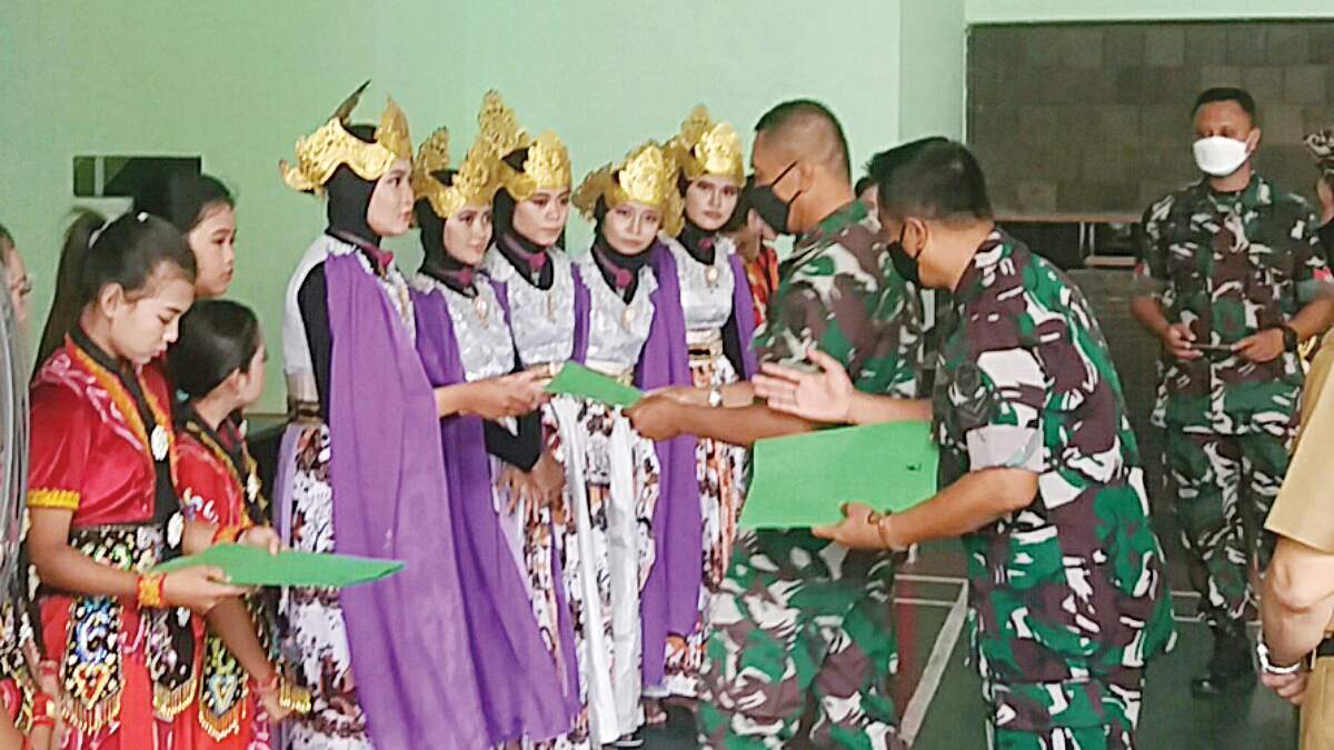 Mewakili Dandim 0620/Kab Cirebon, Letkol Inf Sugir, Kasdim Mayor Inf R Nurbiantoro menyerahkan piagam dan tanda pembinaan pada para juara lomba tari kreasi, Selasa (30/11/2021).* Foto: Humas