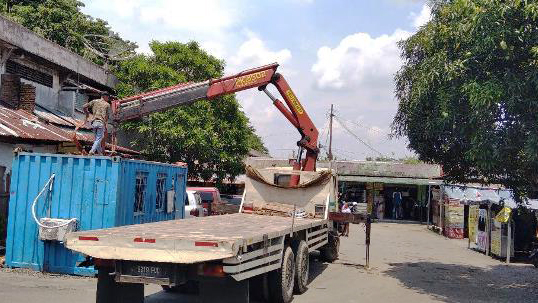 PROSES PENGANGKATAN kontainer milik PT PGA yang menyatakan mundur sebagai mitra Pemkab Majalengka dalam rencana revitalisasi Pasar Sindangkasih.* Foto: Dins/SC