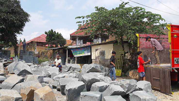 Pengrajin batu alam yang sedang angkut bongkar batu alam.* Foto: Sarrah/SC