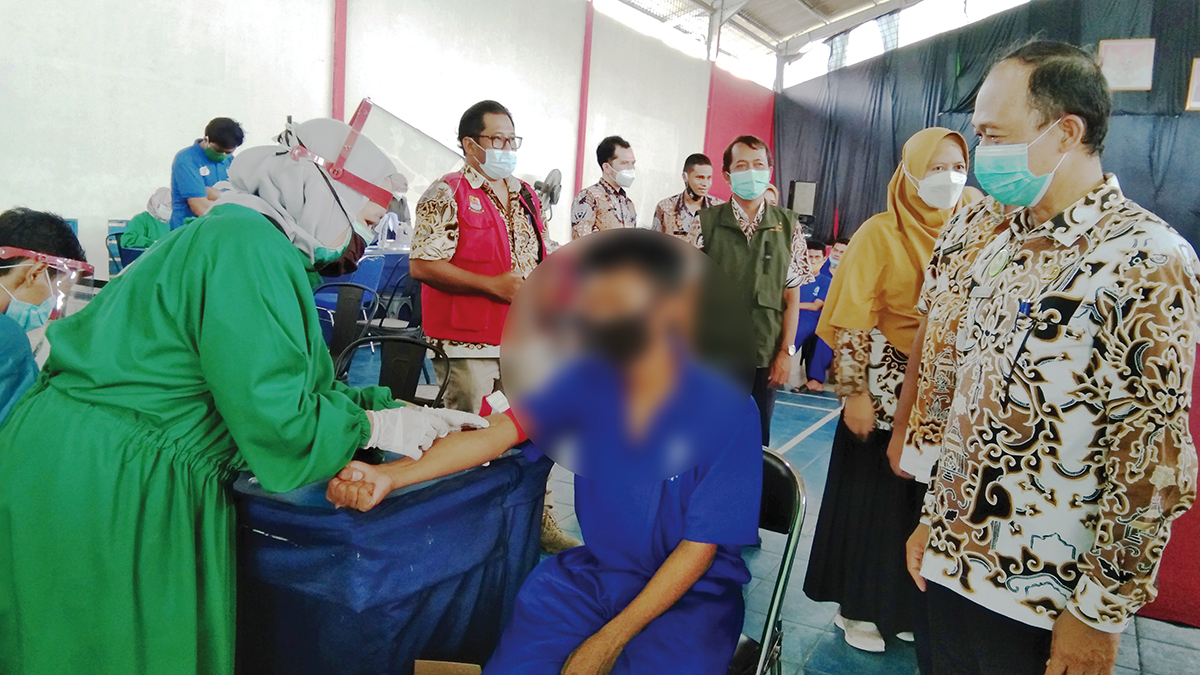 Plt Kadinkes Kabupaten Cirebon, dr Bambang Sumardi menyaksikan langsung skrining HIV/AIDS warga binaan Lapas Narkotika Gintung, Kamis (9/12/2021). Foto: Islah/SC
