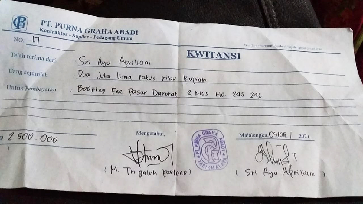 Dirinya dan pedagang lainnya tidak khawatir dan curiga, karena diberikan bukti pembayaran berupa kwitansi milik perusahaan.