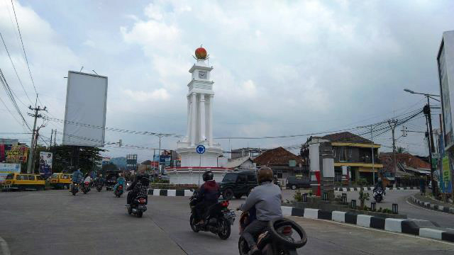 TUGU MANGGA Gedong Gincu di Bundaran Cigasong disebut-sebut mirip menara Jam Gadang di Sumatera Barat.* Foto: ABR/SC