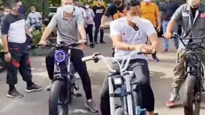 MENTERI PARIWISATA dan Ekonomi Kreatif Sandiaga Uno saat mencoba sepeda listrik yang disebut-sebut buatan warga Majalengka.*Foto: Istimewa
