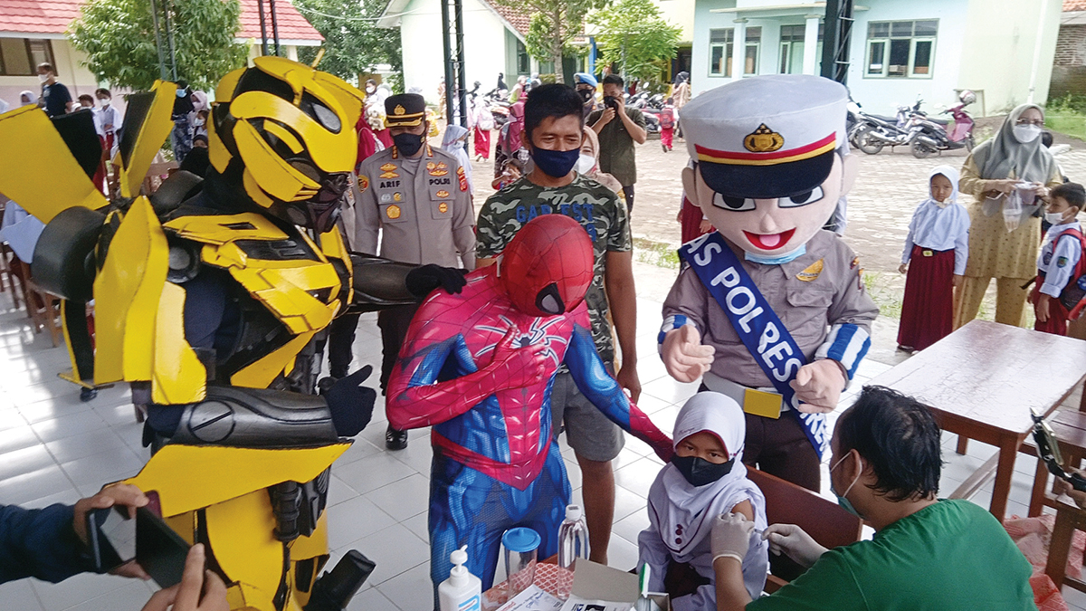 SUASANA di SDN 4 Kenanga dan SDN 1 Tukmudal Kecamatan Sumber, Kabupaten Cirebon, Senin (10/1/202) pagi, mendadak ramai. Tak seperti biasanya, sejumlah tokoh superhero yang menjadi idola anak-anak seperti Spiderman, Transformer Bumblebee dan Maskot Polisi Lalu Lintas (Polantas) menyambagi sekolah mereka. Kehadiran tokoh superhero itu bukan untuk melawan penjahat yang mengancam keamanan dunia, tetapi demi menghibur ratusan murid di SDN 4 Kenanga dan SDN 1 Tukmudal yang akan mengikuti vaksinasi Covid-19 yang digelar Polresta Cirebon bagi anak-anak usia 6-11 tahun.