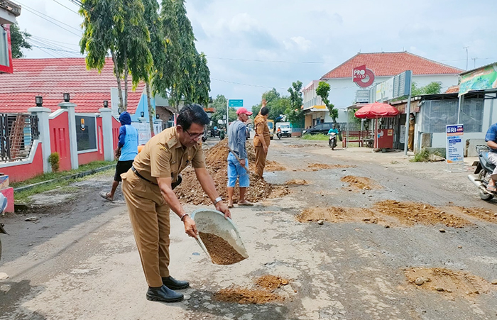 CIREBON, SC- Kondisi jalan poros desa antara Pelayangan-Pabedilan tepatnya di depan Kantor Desa Tersana, Kecamatan Pabedilan, Kabupaten Cirebon, banyak yang  mengalami kerusakan. Di beberapa titik ruas jalan tersebut, banyak ditemui lubang dengan lebar dan kedalaman beragam. Kondisi tersebut, mendorong Pemdes setempat bersama masyarakat melakukan pengurukan darurat, Selasa (18/1/22).