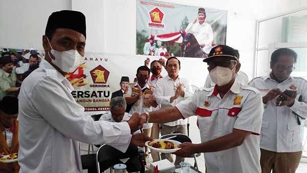 Ketua DPC Gerindra Kota Cirebon, H Eman Sulaeman memberikan potongan tumpeng kepada kader Gerindra Ruri Trilesmana, saat menggelar syukuran HUT ke-14 Gerindra, Minggu (6/2/2022).* Foto: Surya/SC