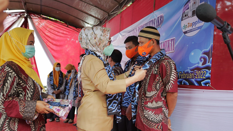 Wakil Wali Kota Cirebon Eti Herawati mengalungkan kain bermotif mega mendung sebagai simbol peresmian Kampung KB di RW 5 Kedungkrisik Utara.* Foto: Surya/SC