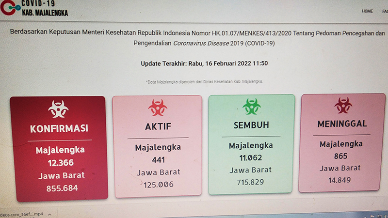MAJALENGKA, SC- Dalam tiga hari terakhir kasus terkonfirmasi COVID-19 di Kabupaten Majalengka terus menunjukan peningkatan. Berdasarkan data dari pusat informasi dan koordinasi COVID-19 Kabupaten Majalengka (Pikom) Rabu, 16 Februari 2022 Pukul 11:50 WIB sejak mulai terjadi pendemi warga yang terkonfirmasi tercatat sebanyak 12.336.