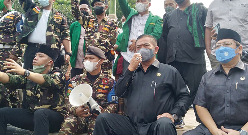 Wali Kota Cirebon, H Nashrudin Azis duduk bersama anggota Ansor dan Banser Kota dan Kabupaten Cirebon yang melakukan aksi damai membela Menag Yaqut Cholil Qoumas di depan Balai Kota Cirebon, Selasa (1/3/2022).* Foto: Surya/SC