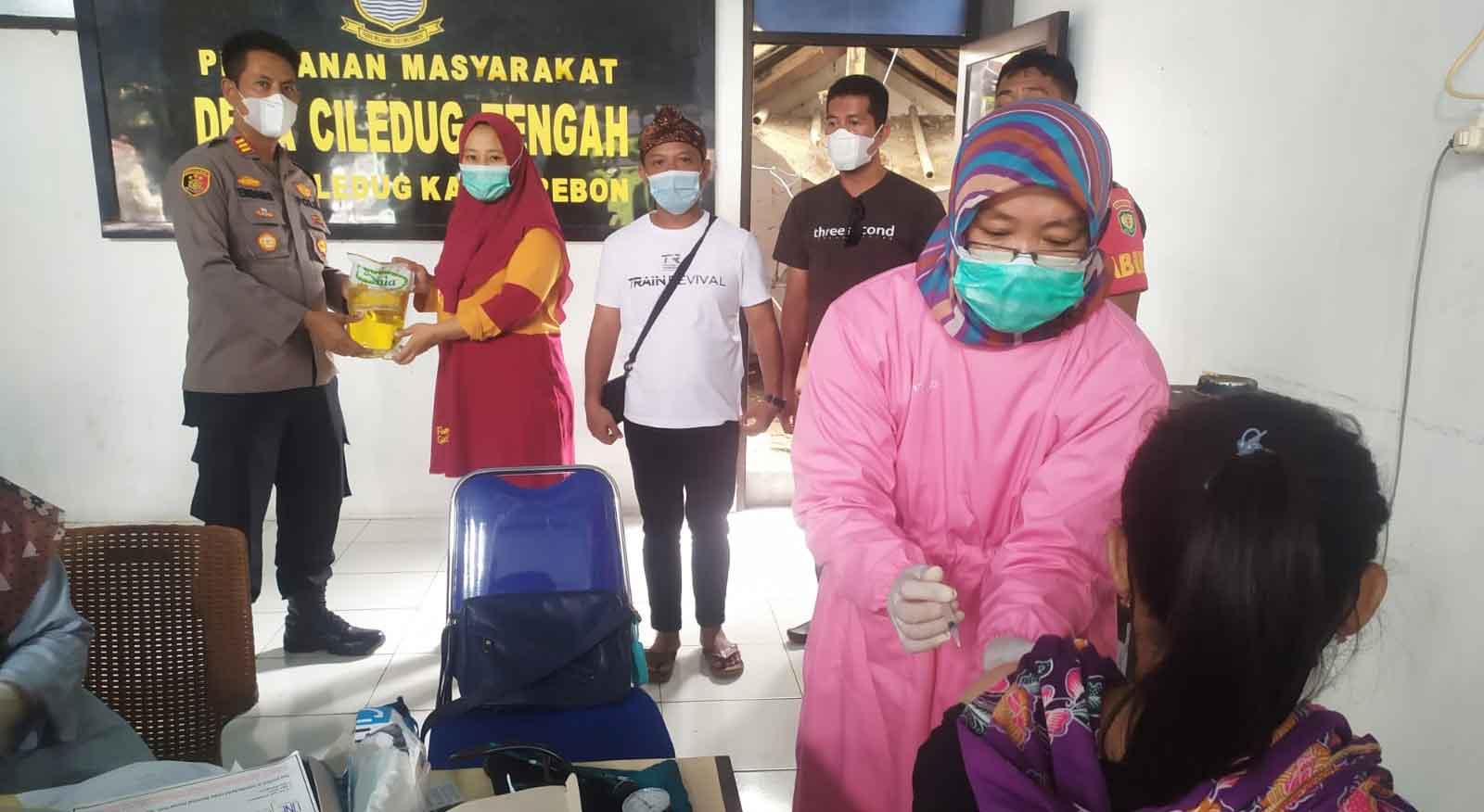 Kapolsek Pabuaran, AKP Endang Kusnandar memberikan minyak goreng kepada warga di Desa Ciledug Tengah, Kecamatan Ciledug, Kabupaten Cirebon yang divaksin, Sabtu (5/3/2022).* (Foto: Istimewa)
