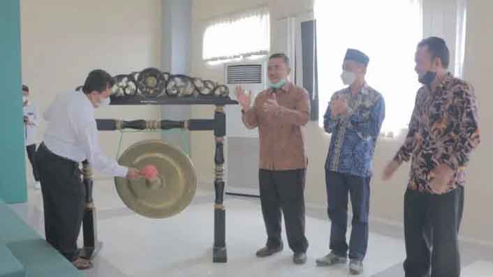 Wakil Rektor III IAIN Syekh Nurjati Cirebon, Dr H Ilman Nafi’a MAg memukul gong sebagai tanda dibukanya acara pelantikan dan rakernas ikatan mahasiswa PIAUD seluruh Indonesia di kampus setempat, Senin (14/3/2022).* (Foto: Istimewa)