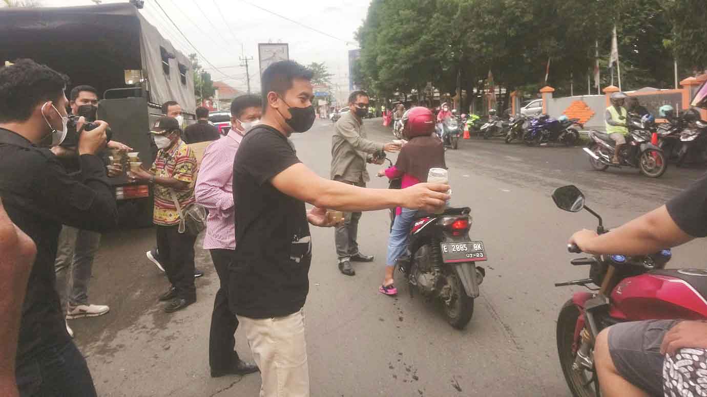 Kasat Resnarkoba Polresta Cirebon, Danu R Atmaja memimpin pembagian takjil di depan Mapolresta, Kamis (7/4/2022).* (Foto: Islah/Suara Cirebon)