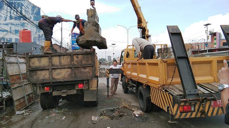 KABUPATEN CIREBON, SC- Forum Lalu Lintas Kabupaten Cirebon mulai melakukan pengangkatan barrier (penghalang, red) beton di jalur Pantura Arjawinangun, tepatnya di depan Pasar Sandang Tegalgubug, Senin (18/4/2022).