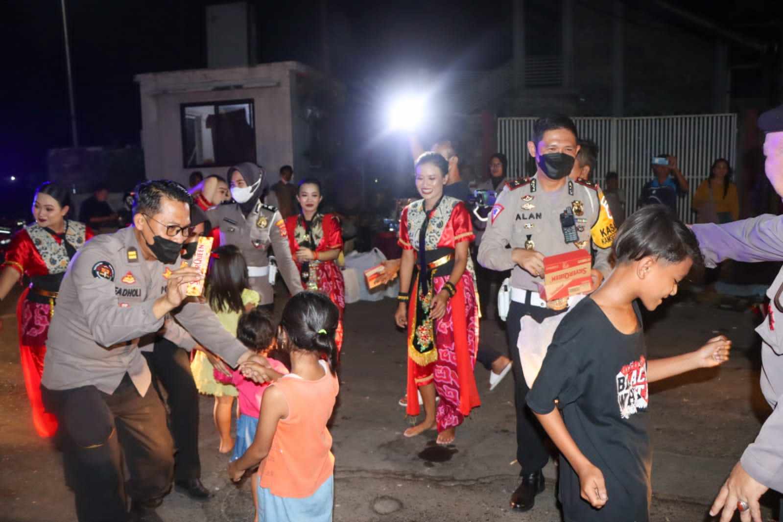 KABUPATEN CIREBON, SC- Para pemudik yang akan kembali ke perantauan mendapat sajian hiburan dari Polresta Cirebon di SPBU Tegalkarang, Kecamatan Palimanan, Kabupaten Cirebon, Minggu (8/5/2022).